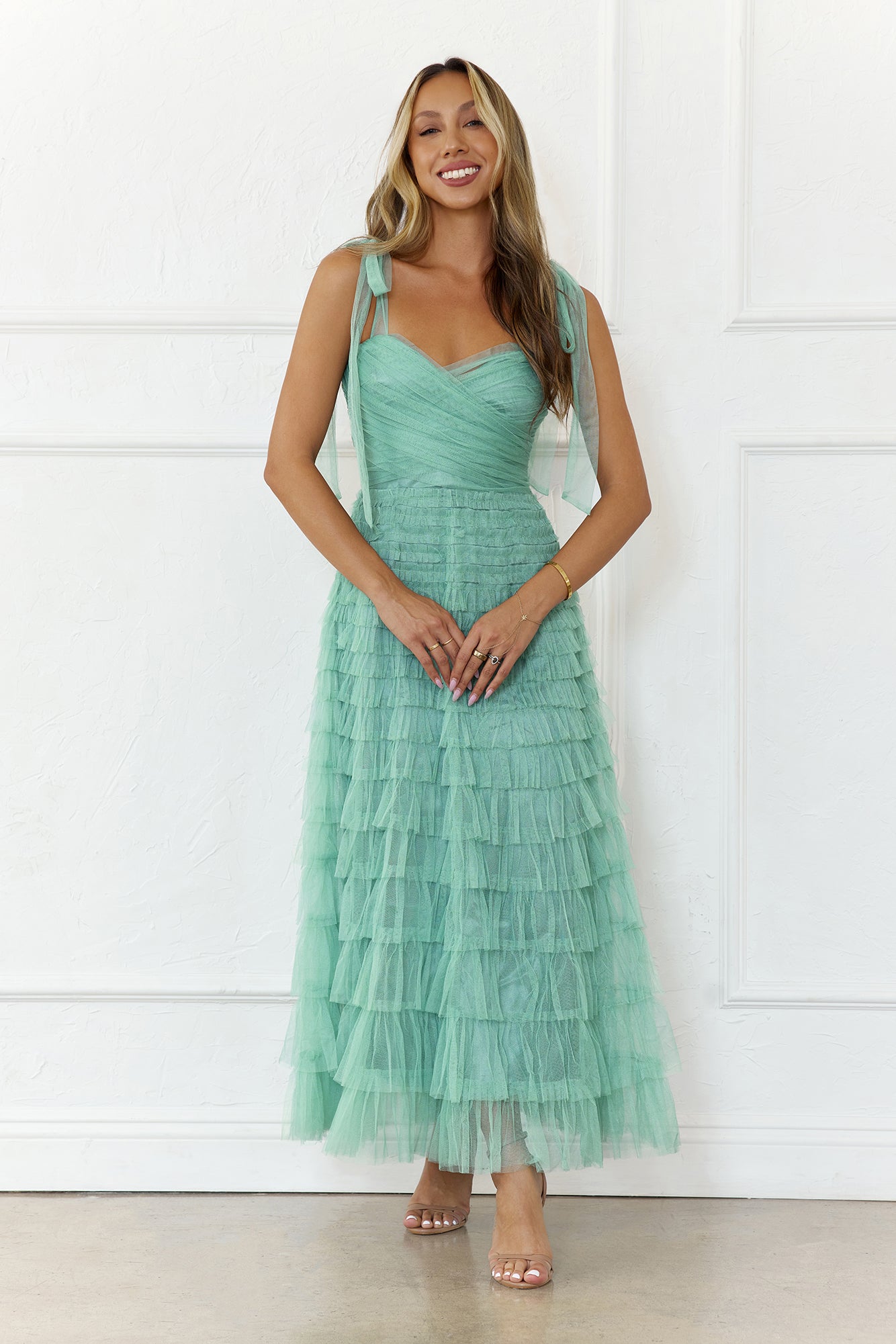 Ethereal and romantic, the Forever In Fleur Maxi Dress is crafted from soft tulle for a beautifully flowy silhouette. Featuring delicate tie-up shoulder straps and a twisted neckline, this dreamy design moves gracefully with every step—perfect for garden parties, weddings, or any moment made for elegance.