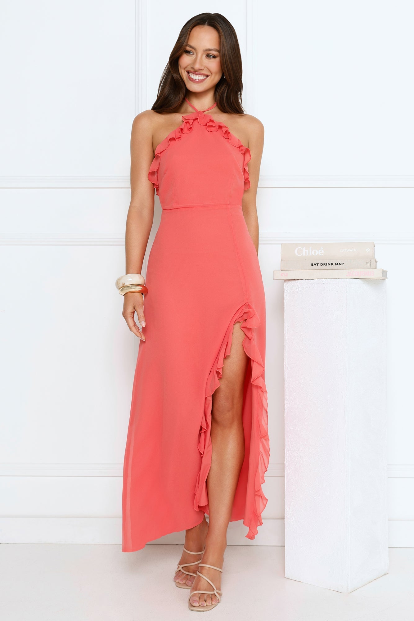 Feel effortlessly enchanting in the Love Potion Halter Maxi Dress, featuring a delicate halter tie, frill trim along the neckline, and flirty frill detailing at the skirt split for the perfect romantic touch! Style with heels.